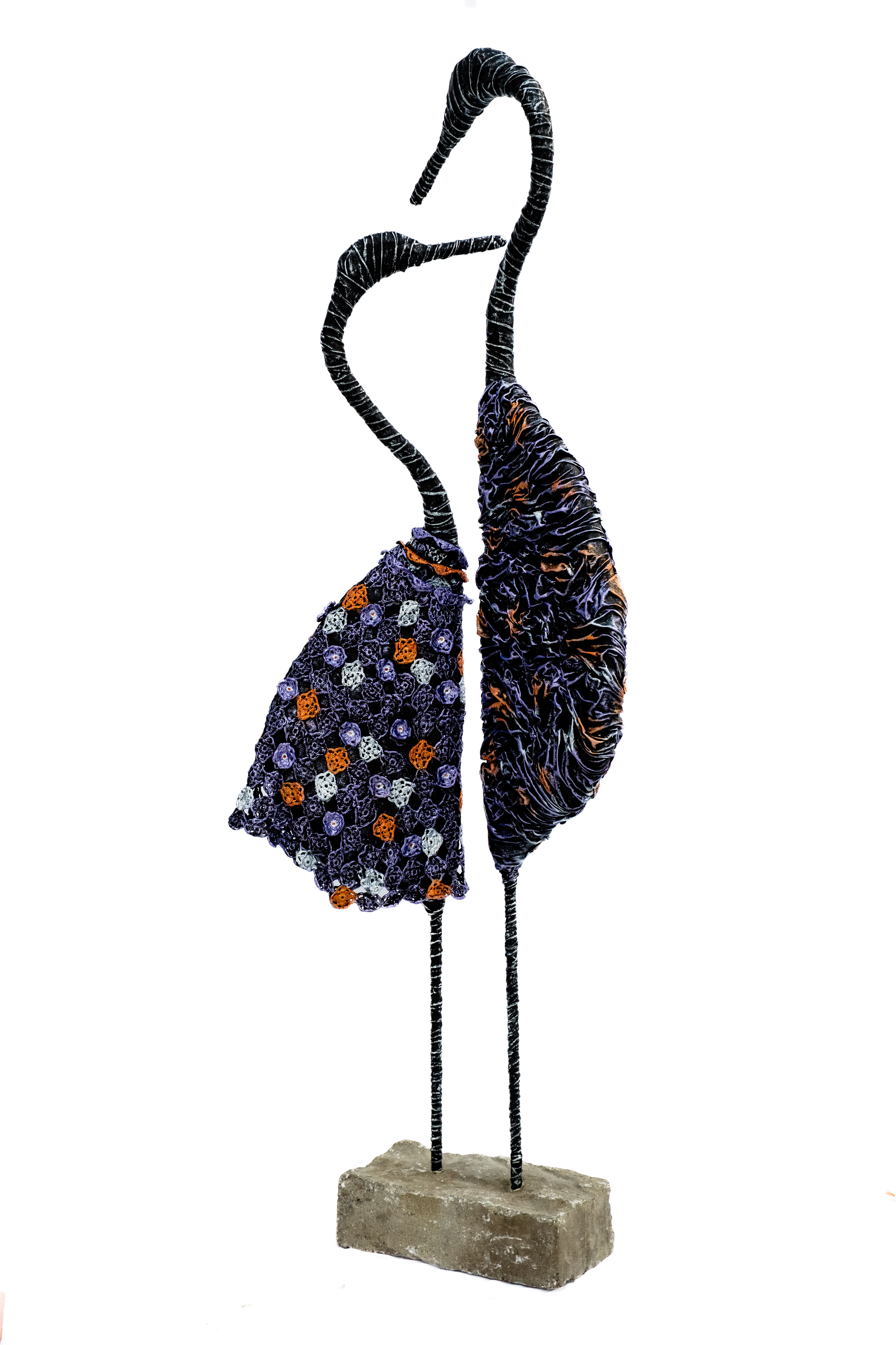 Elle crée des sculptures à partir de matières récupérées parce que je crois profondément que ce que l’on considère comme « usé », « dépassé » ou « jetable » porte encore une beauté, une mémoire et un potentiel immense. Les dentelles et tissus naturels, les objets oubliés ou destinés aux déchets deviennent, entre mes mains, des présences durables qui célèbrent le travail passé, la patience des gestes artisanaux et la valeur des matières que l’on a trop vite tendance à gaspiller.